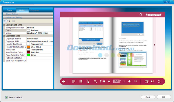 Phần “Option” sẽ bao gồm các thiết lập cơ bản và nâng cao. Các thiết lập cơ bản cho phép bạn tùy chỉnh thông số của Controller Options (chẳng hạn như: ẩn nút bookmark/menu/copyright/download, vv), Flippong Options (như: Flipping Interval Time, Flipping Speed, Hardcover, vv), Layout Options như kích thước sách và cửa sổ, Preloader Options. Trong khi đó, các thiết lập nâng cao cho phép bạn tùy chỉnh phong cách background, bao gồm cả vị trí và màu sắc cho background, vv cũng như điều chỉnh Controller Style, chẳng hạn như: tên bản quyền, URL, màu biểu tượng và nhiều hơn nữa.
